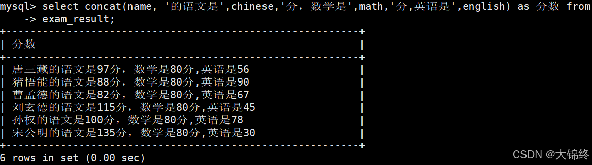 - 要求显示exam_result表中的信息,显示格式:"XXX的语文是XXX分,数学XXX分,英语XXX分"