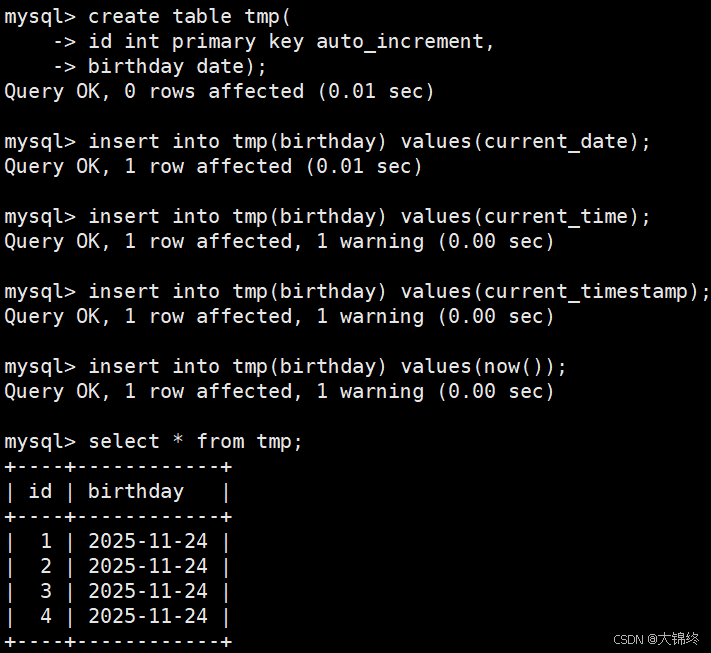 - 创建一张表记录生日并添加当前日期