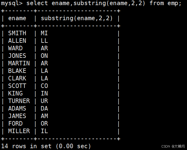 - 截取EMP表中ename字段的第二个到第三个字符