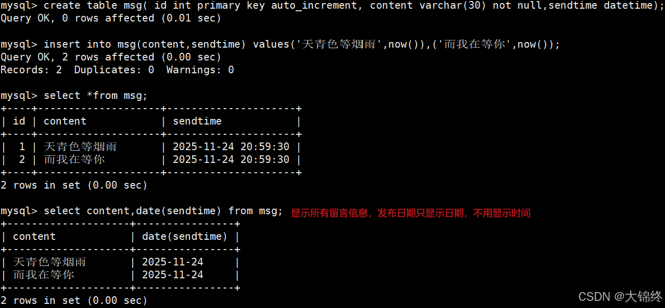 - 创建一个留言表并插入数据
