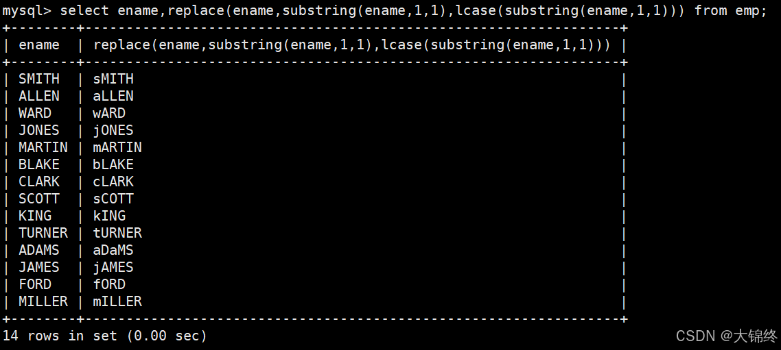 select concat(lcase(substring(ename, 1, 1)),substring(ename,2)) from EMP;