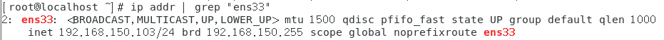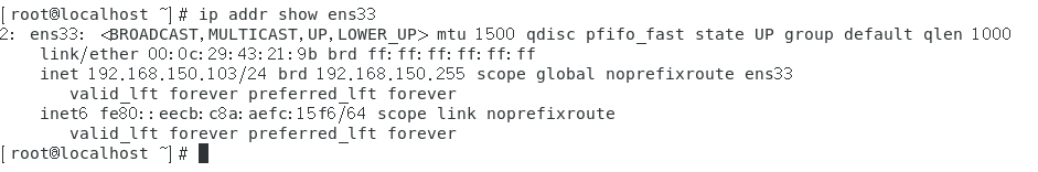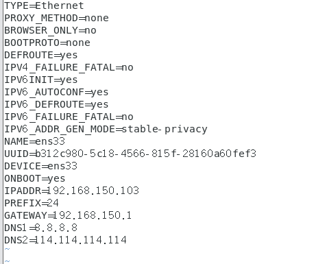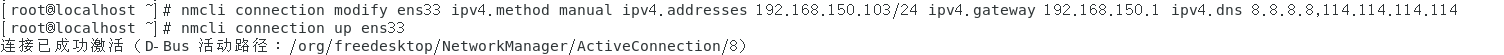 nmcli connection modify ens33 ipv4.method manual ipv4.addresses 192.168.150.103/24 ipv4.gateway 192.168.150.1 ipv4.dns 8.8.8.8,114.114.114.114