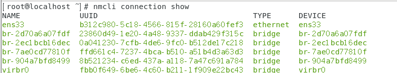 nmcli connection show # 输出中"NAME"列即为连接名(如ens33)