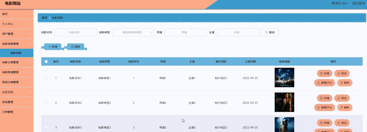 电影信息管理;在电影信息管理页面可以对索引,电影名称,电影类型,电影评分,导演,主演,制片地区,上映日期,电影海报等信息进行详情,查看评论,修改或删除等操作,如图5-11所示。