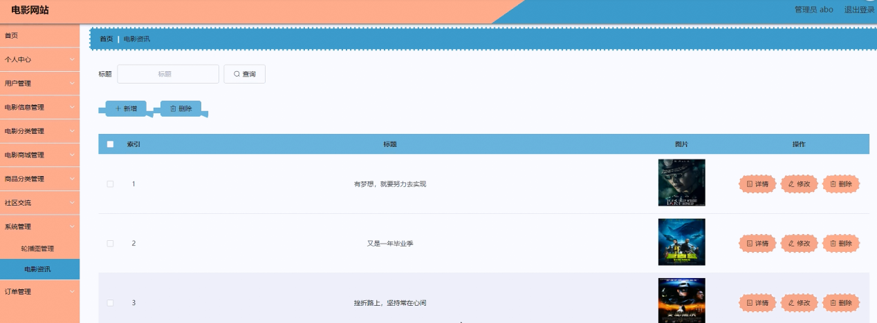 系统管理;在电影资讯页面可以对索引,标题,图片等内容进行详情,修改或删除等操作,还可以对轮插图管理进行详细的操作;如图5-15所示。