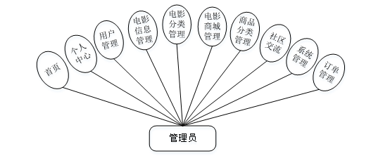 (3)管理员通过系统可以实现电影网站,主要包括首页,个人中心,用户管理,电影信息管理,电影分类管理,电影商城管理,商品分类管理,社区交流,系统管理,订单管理等功能。管理员用例图如图3-3所示。