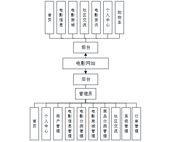 本系统的用户可分为用户和管理员两个用户角色组成。管理员可以管理系统内所有功能,主要有首页,个人中心,用户管理,电影信息管理,电影分类管理,电影商城管理,商品分类管理,社区交流,系统管理,订单管理等功能;