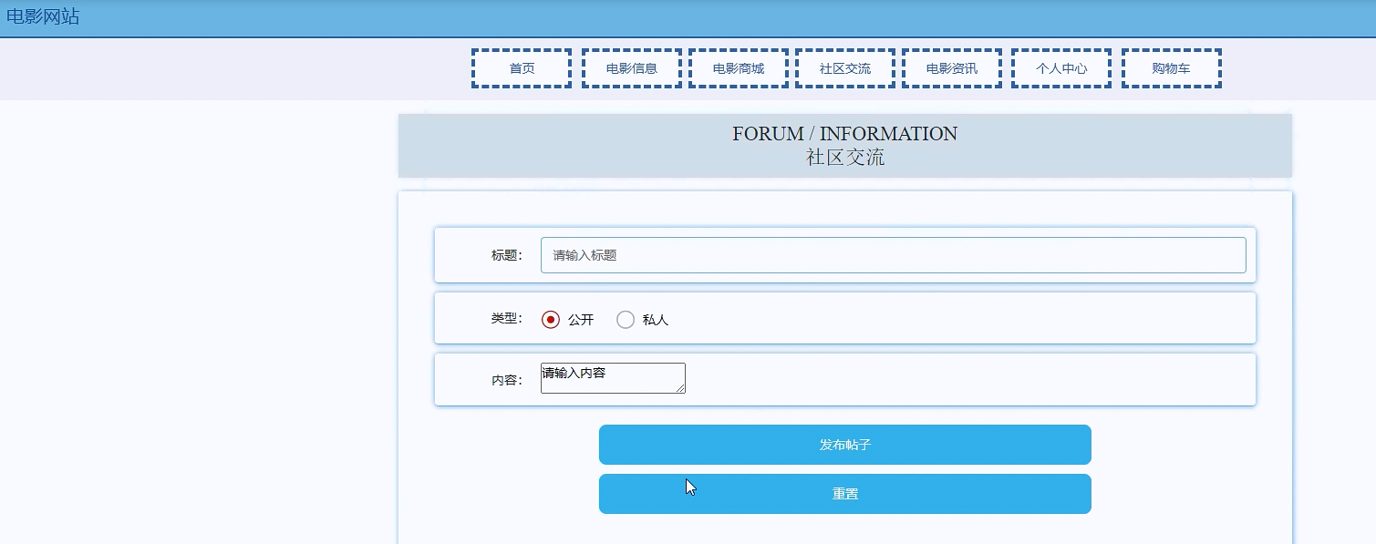 社区交流;在社区交流页面通过填写标题,类型,内容等内容进行发布帖子或重置操作,如图5-6所示。
