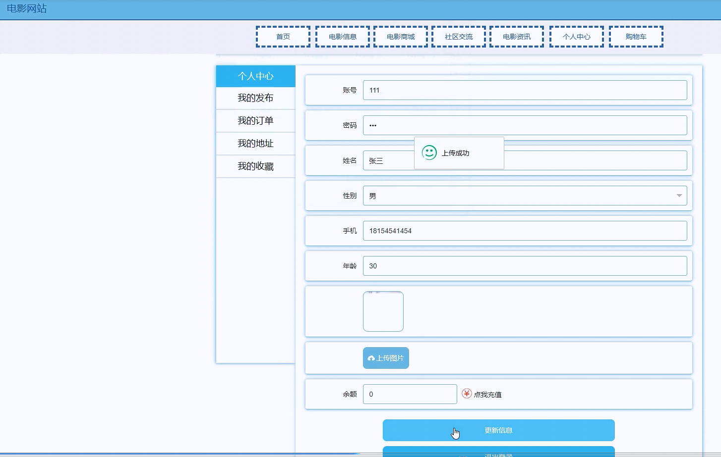 个人中心;在个人中心页面通过填写账号,密码,姓名,性别,手机,年龄,上传图片,余额等信息进行更新操作,还可以对我的发布,我的订单,我的地址和我的收藏进行相应操作,如图5-7所示。