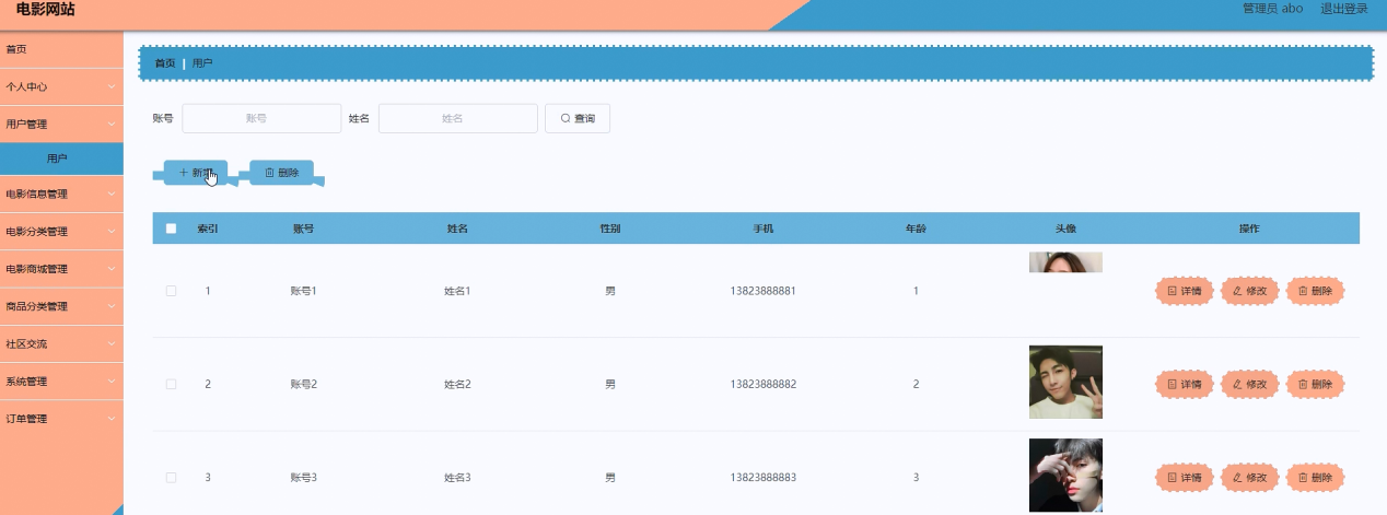 用户管理;在用户管理页面可以对索引,账号,姓名,性别,手机,年龄,头像等内容进行详情,修改或删除等操作,如图5-10所示。