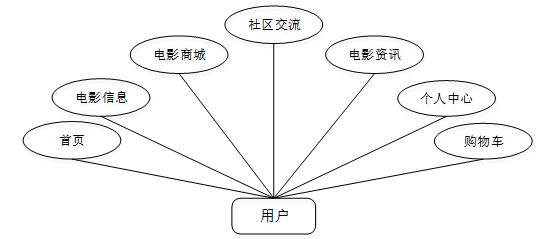 (2)用户模块主要包括首页,电影信息,电影商城,社区交流,电影资讯,个人中心,购物车等功能,用户用例图如图3-2所示。