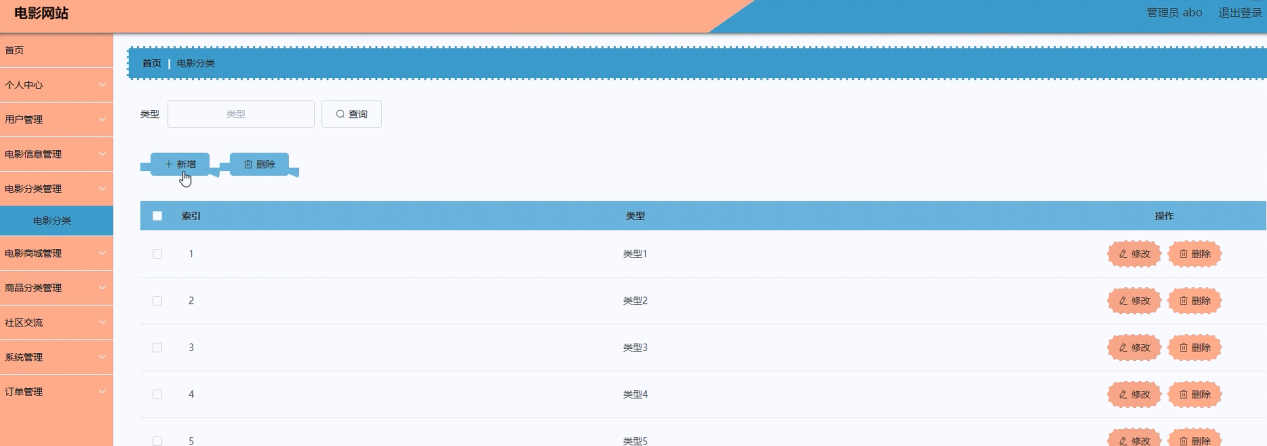 电影分类管理;在电影分类管理页面可以对索引,类型等内容进行修改或删除等操作,如图5-12所示。
