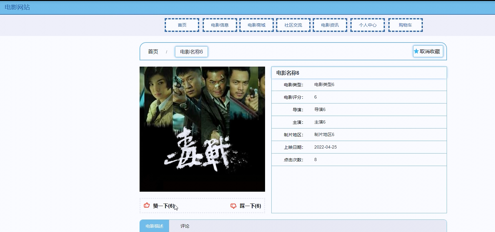 电影信息;在电影信息页面可以查看电影名称,电影类型,电影评分,导演,主演,制片地区,上映日期,点击次数等详细内容,并进行评论和收藏操作,如图5-4所示。