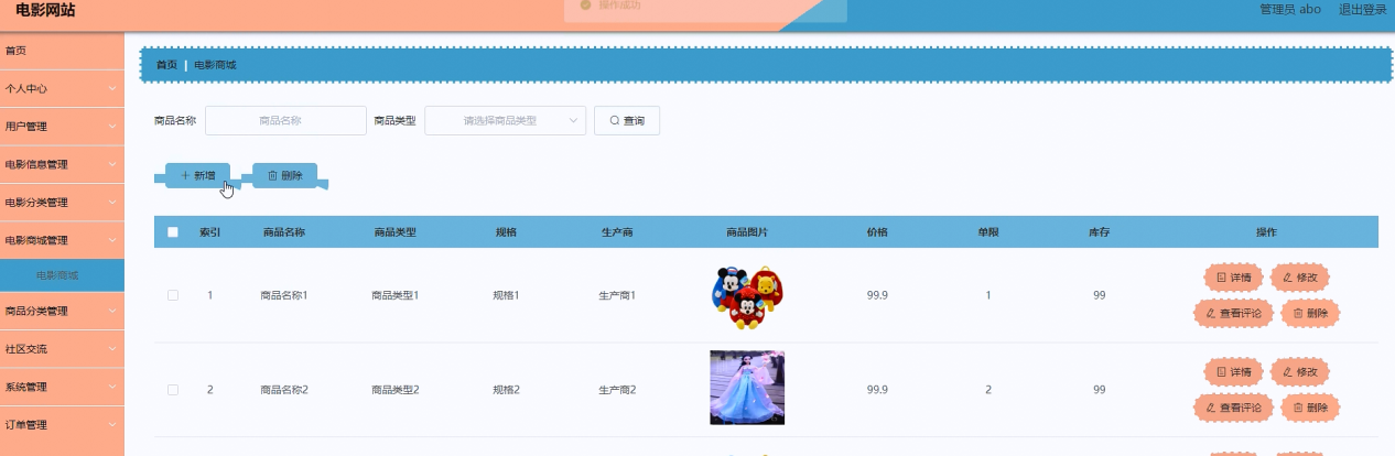 电影商城管理;在电影商城管理页面可以对索引,商品名称,商品类型,规格,生产商,商品图片,价格,单限,库存等内容进行详情,查看评论,修改或删除等操作,如图5-13所示。