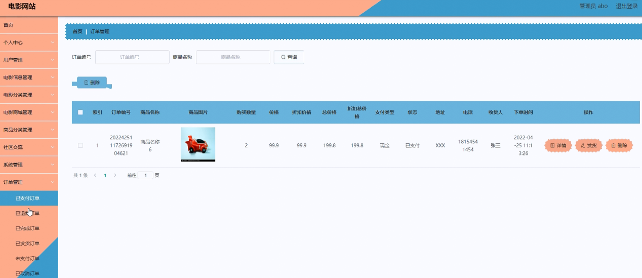 订单管理;在订单管理页面可以对索引,订单编号,商品名称,商品图片,购买数量,价格,折扣价格,总价格,折扣总价格,支付类型,状态,地址,收货人,下单时间等内容进行详操作,如图5-16所示。