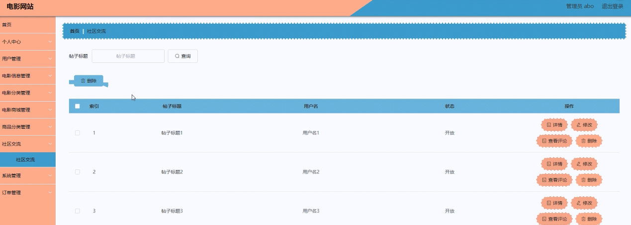 社区交流;在社区交流页面可以对索引,帖子标题,用户名,状态等内容进行详情,查看评论,修改或删除等操作,如图5-14所示。