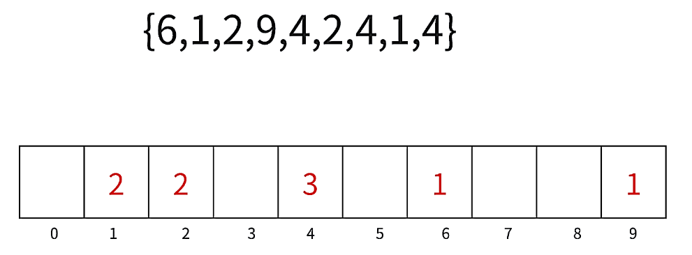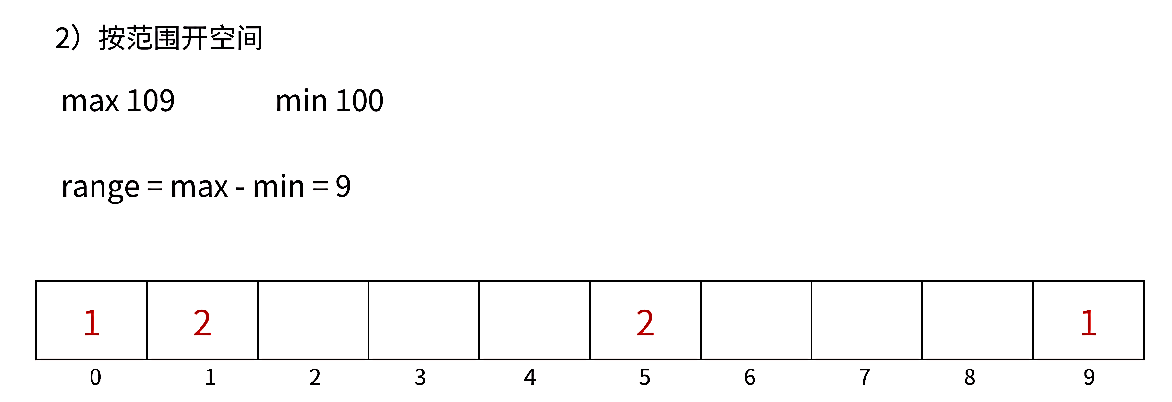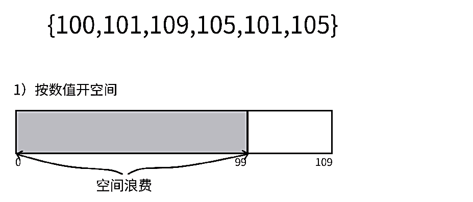 但是我们想一个问题,如果此时有一个数组里面数据为{100, 101, 109, 105, 101, 105},这样的话按照上面的操作步骤我们是不是就需要创建一个大小为 sizeof(int)*110 的数组,但是我们发现最小的数都已经是100了,这就会导致一个问题: