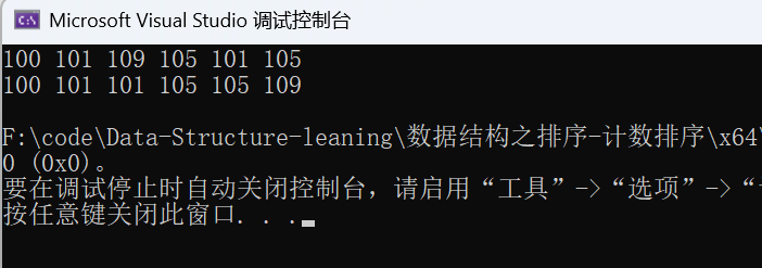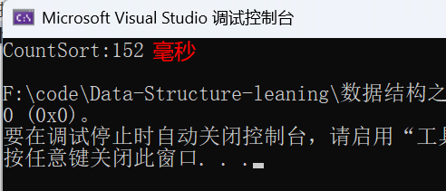 我们会发现在数据量为一千万的情况下计数排序所消耗的时间都只有一百多毫秒,而在前面不管是希尔排序还是快速排序,在这个数据量的情况下所消耗的时间都是接近一秒的,这就足以见得计数排序的效率之高。