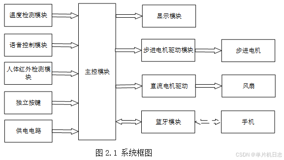基于STM32的蓝牙语音识别风扇控制系统所包含的模块有温度检测模块、语音控制模块、人体洪维恰检测模块、独立按键模块、供电模块、显示模块、步进电机驱动模块控制步进电机模块、直流电机驱动模块风扇模块、手机和蓝牙接收数据的发送指令模块。温度检测模块获取风扇周围的温度;语音识别模块用来语音控制风扇的工作;按键模块可以风扇不同挡位对应的风速及其风扇的运行;供电模块给整个系统进行供电;显示模块,将检测的风扇的温度设置的温度及其风扇运行状态进行显示;步进电机驱动模块,通过该模块输出不同的电平控制步进电机旋转不同的角度;直流电机驱动模块,输出不同的脉冲控制风扇不同的转速;蓝牙模块连接手机,将检测的数据传输到手机上,也可以通过手机发送指令控制风扇的运行。下图此次设计的系统的系统框图。