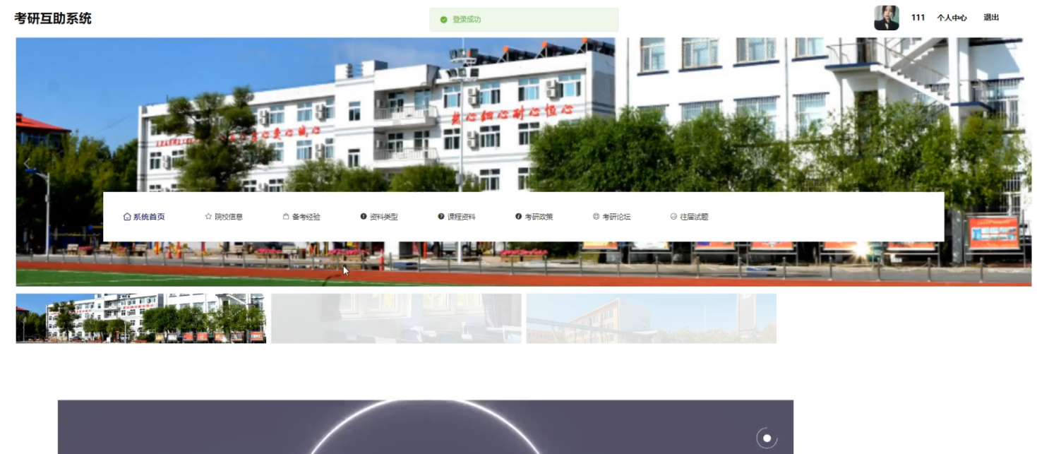 当游客打开系统的网址后,首先看到的就是首页界面。在这里,游客能够看到系统首页、院系信息、备考经验、资料类型、课程资料、考研政策、考研论坛、往届试题、个人中心。系统首页界面如图5-1所示: