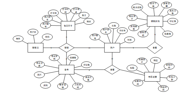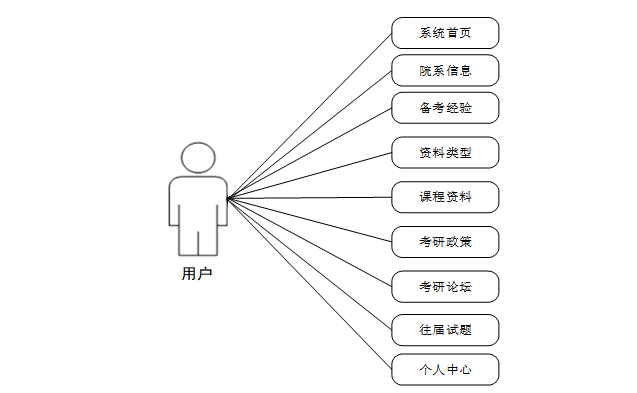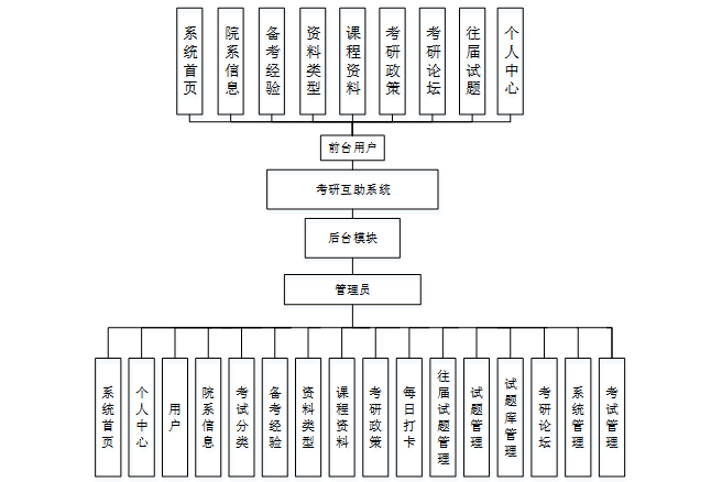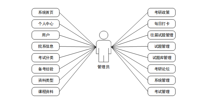 通过调研和分析,该系统的功能设计为注册登录、个人信息修改、用户、院系信息、备考经验、课程资料、考研政策、每日打卡、往届试题、试题、试题库、考研论坛、考试等功能。