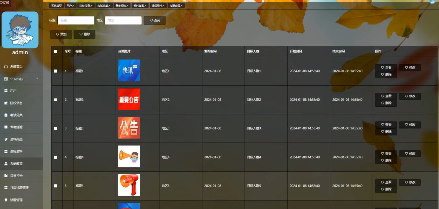 管理员点击考研政策,在考研政策页面对标题、封面图片、地区、发布时间、目标人群、开始时间、结束时间等信息,可以查询、添加或删除考研政策等操作。如图5-15所示: