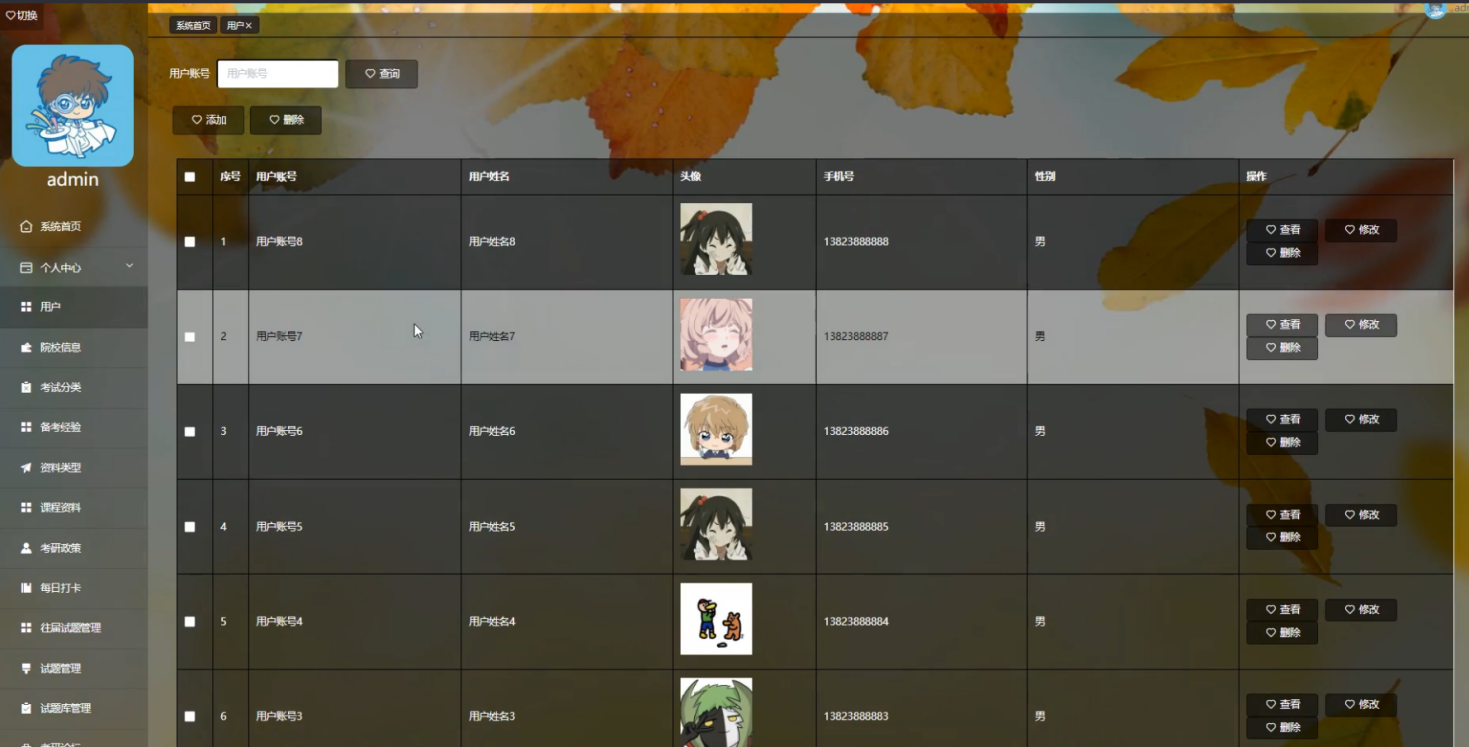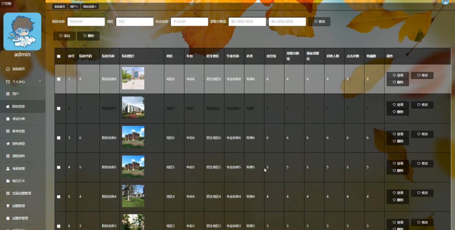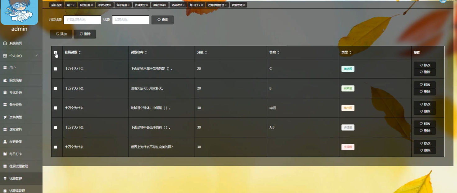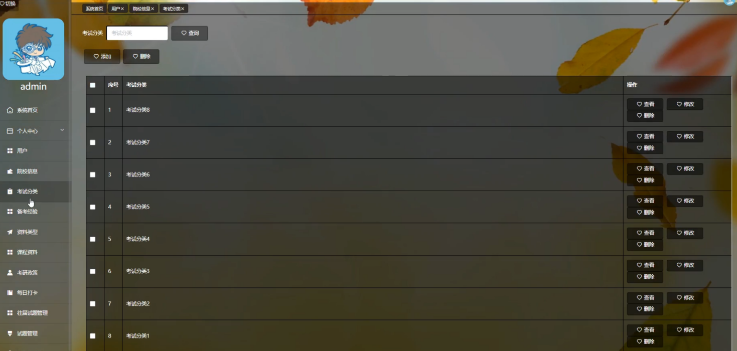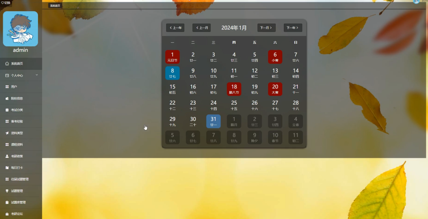 管理员登录进入系统可以查看系统首页、个人中心、用户、院系信息、考试分类、备考经验、资料类型、课程资料、考研政策、每日打卡、往届试题管理、试题管理、试题库管理、考研论坛、系统管理、考试管理等功能,进行详细操作,如图5-8所示。