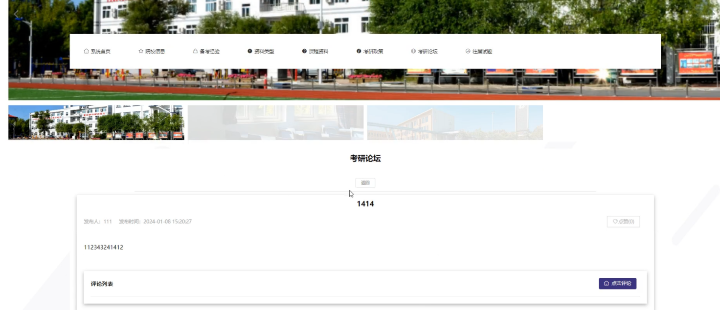 用户点击考研论坛,在考研论坛页面的搜索栏输入标题等信息,进行查询,还可以查看发布人、发布时间等信息,如有需要可以进行点赞或者评论等操作;如图5-4所示: