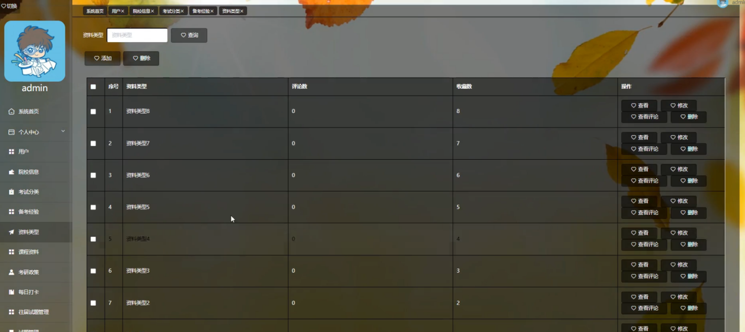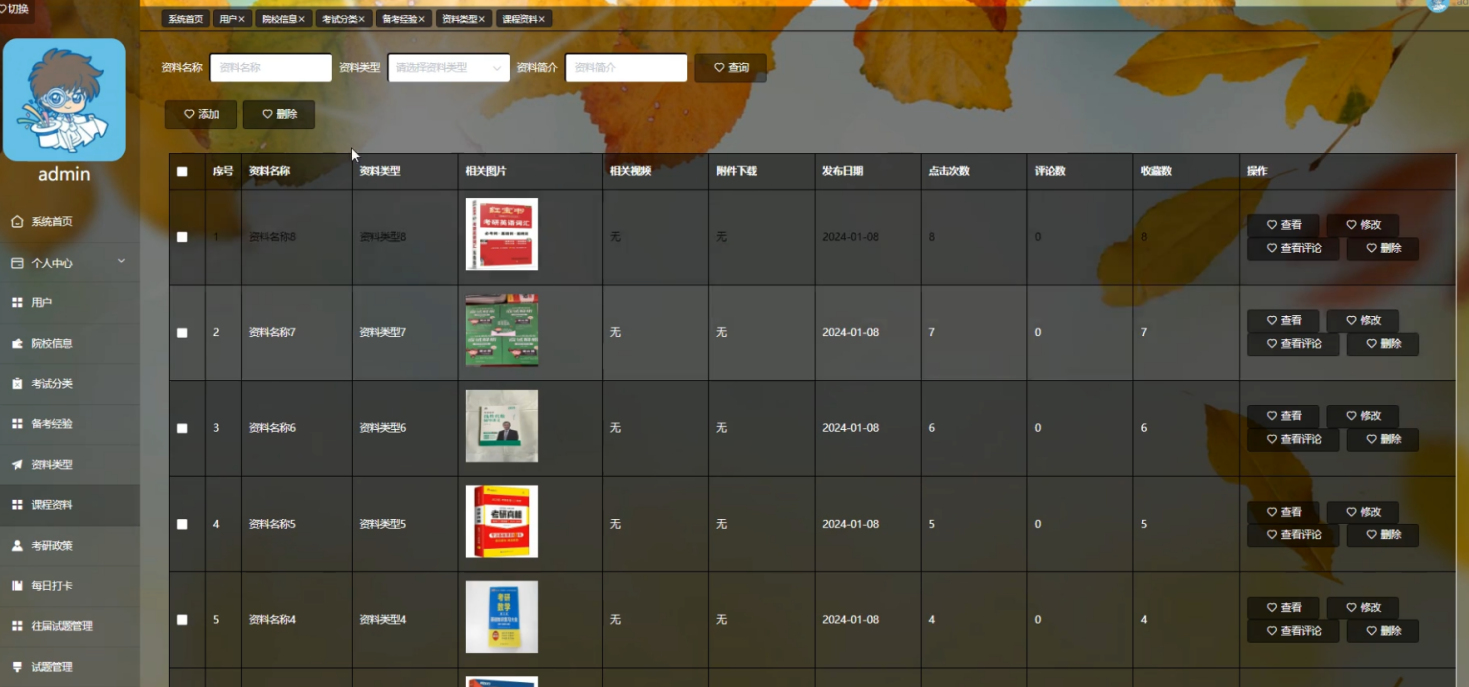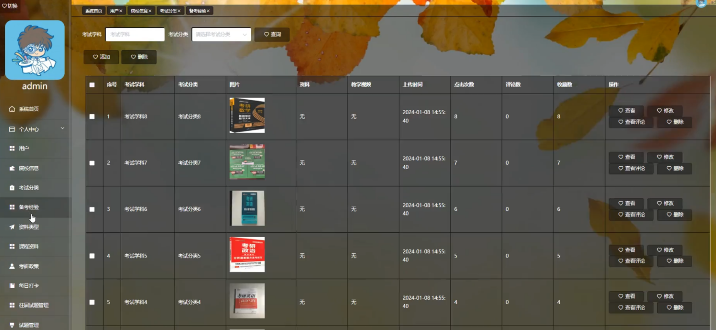管理员点击备考经验,在备考经验页面对考试学科、考试分类、图片、资料、教学视频、上传时间、点击次数、评论数、收藏数等信息,可以查询、添加或删除备考经验等操作。如图5-12所示: