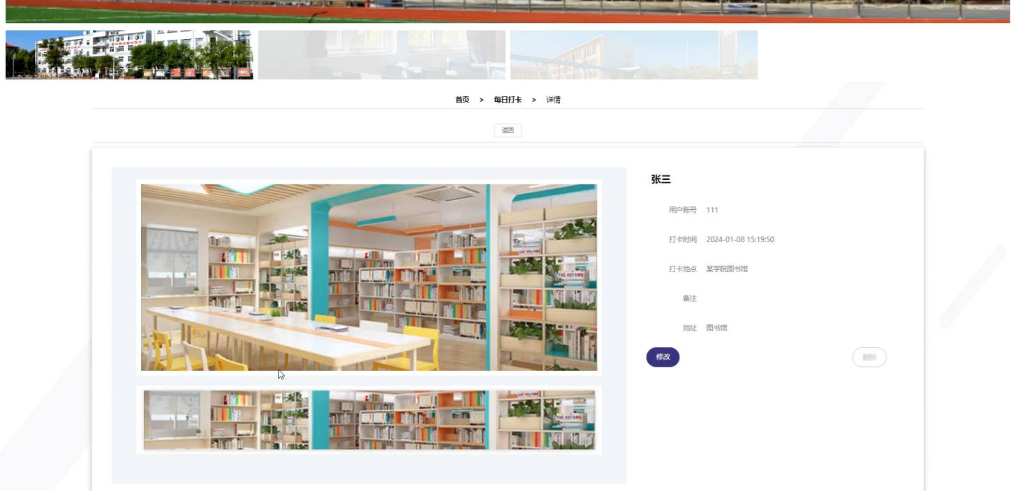 用户点击每日打卡,可以查看用户账号、用户姓名、打卡图、打卡时间、打卡地点、备注、地址等信息,还可以进行修改等详情操作,如图5-5所示: