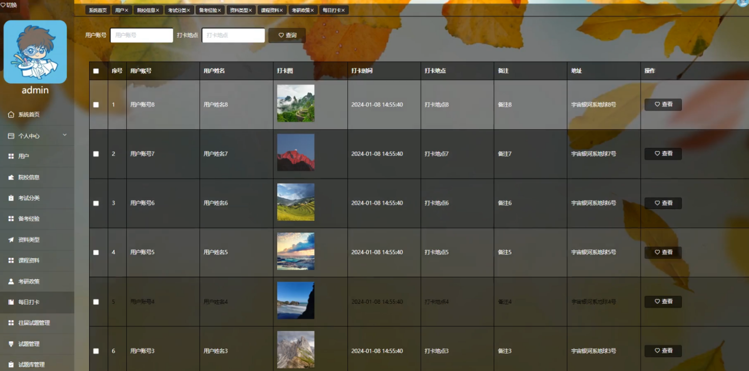 管理员点击每日打卡,在每日打卡页面对用户账号、用户姓名、打卡图、打卡时间、打卡地点、备注、地址等信息,可以查询等操作。如图5-16所示: