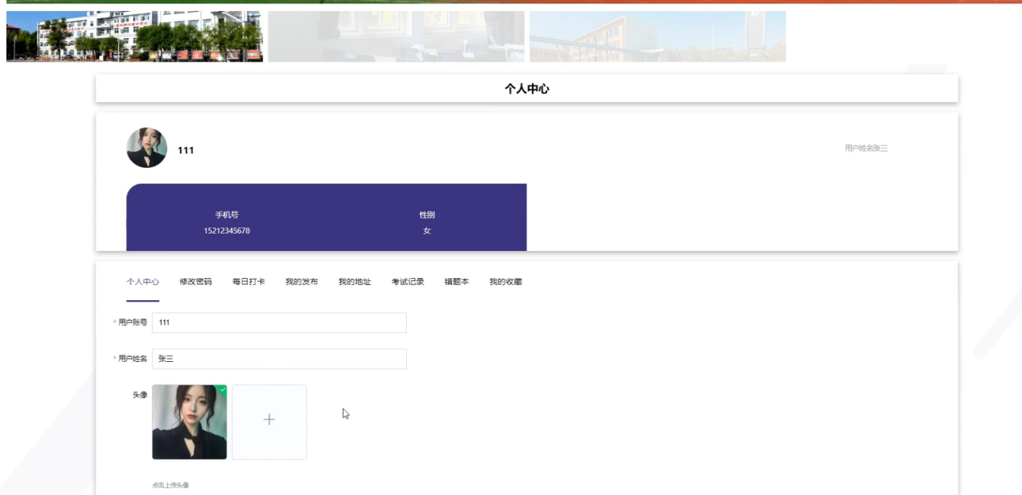 用户点击个人中心,在个人中心页面可以修改个人信息、密码修改,还可以对修改密码、每日打卡、我的发布、我的地址、考试记录、错题本、我的收藏进行详细操作,如图5-6所示。