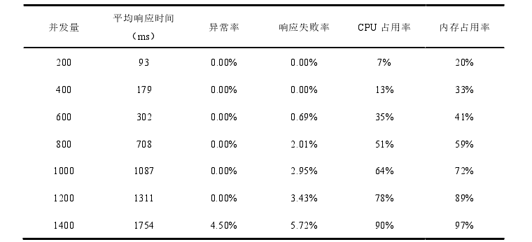 由测试结果可知,在系统并发量逐渐递增到1200的过程中,平均响应时间控制在1.5秒内,异常率保持为0%,响应失败率小于5%} CPU占用率小于80%,内存占用率小于95%,达到了预期的性能目标。当并发量达到1400时,有一部分请求出现异常,各项性能指标也超出以上标准,说明目前系统在1400并发请求时达到了性能瓶颈。