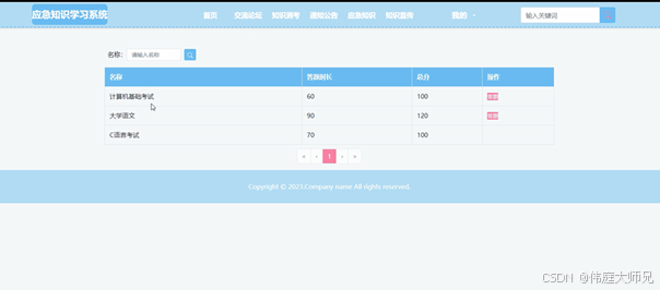 知识测评,在调查问卷页面用户可以查看名称、答题时长、总分等信息,并可进行答题、查询等操作,如下图所示。