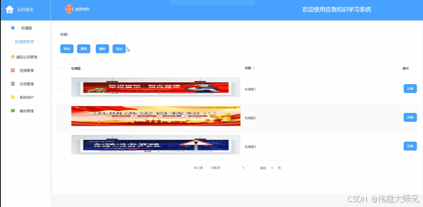轮播图管理,在轮播图管理页面管理员可以对标题、封面图、等信息进行新增、修改、删除、查询等操作,如下图所示。