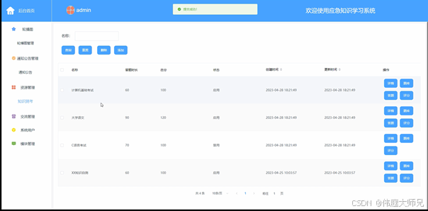 知识测评,在知识测评页面管理员可以对名称、答题时长、总分、状态、创建时间、更新时间等信息进行新增、修改、删除、查询等操作,还可进行详情、题库、答题、评分等操作,如下图所示。