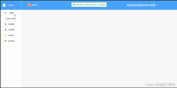 管理员进入系统后台后,可在首页查看首页、轮播图、通知公告管理、资源管理(知识测考)、交流管理(交流论坛、论坛分类)、系统用户管理(管理员、普通用户)、模块管理(知识分类、应急知识、知识宣传)等模块,并进行相对应的操作,如下图所示。