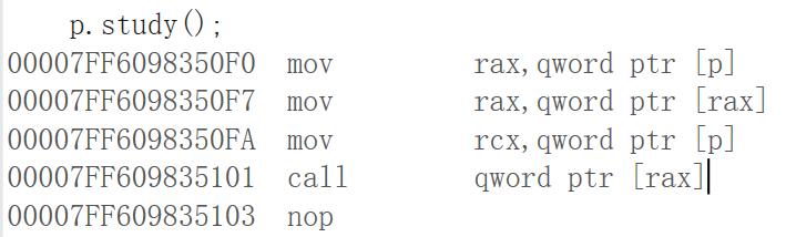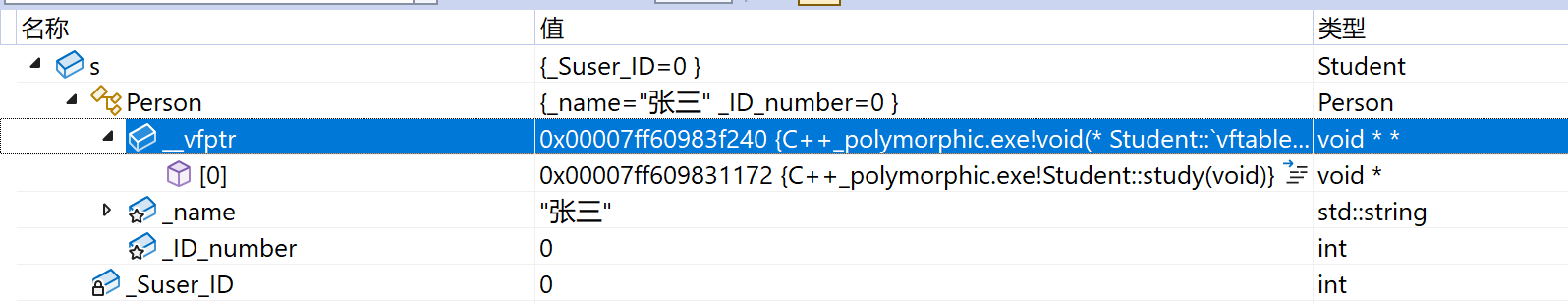 这里__vfptr就是虚函数表指针,里面存储的就是study这个虚函数的地址。