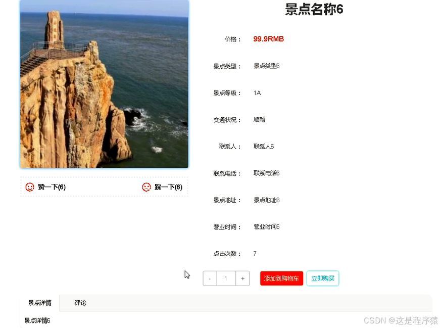 用户可选择景点查看详情信息,登录后可进行添加购物车或者购买操作,景点详情界面展示如图5-5所示。