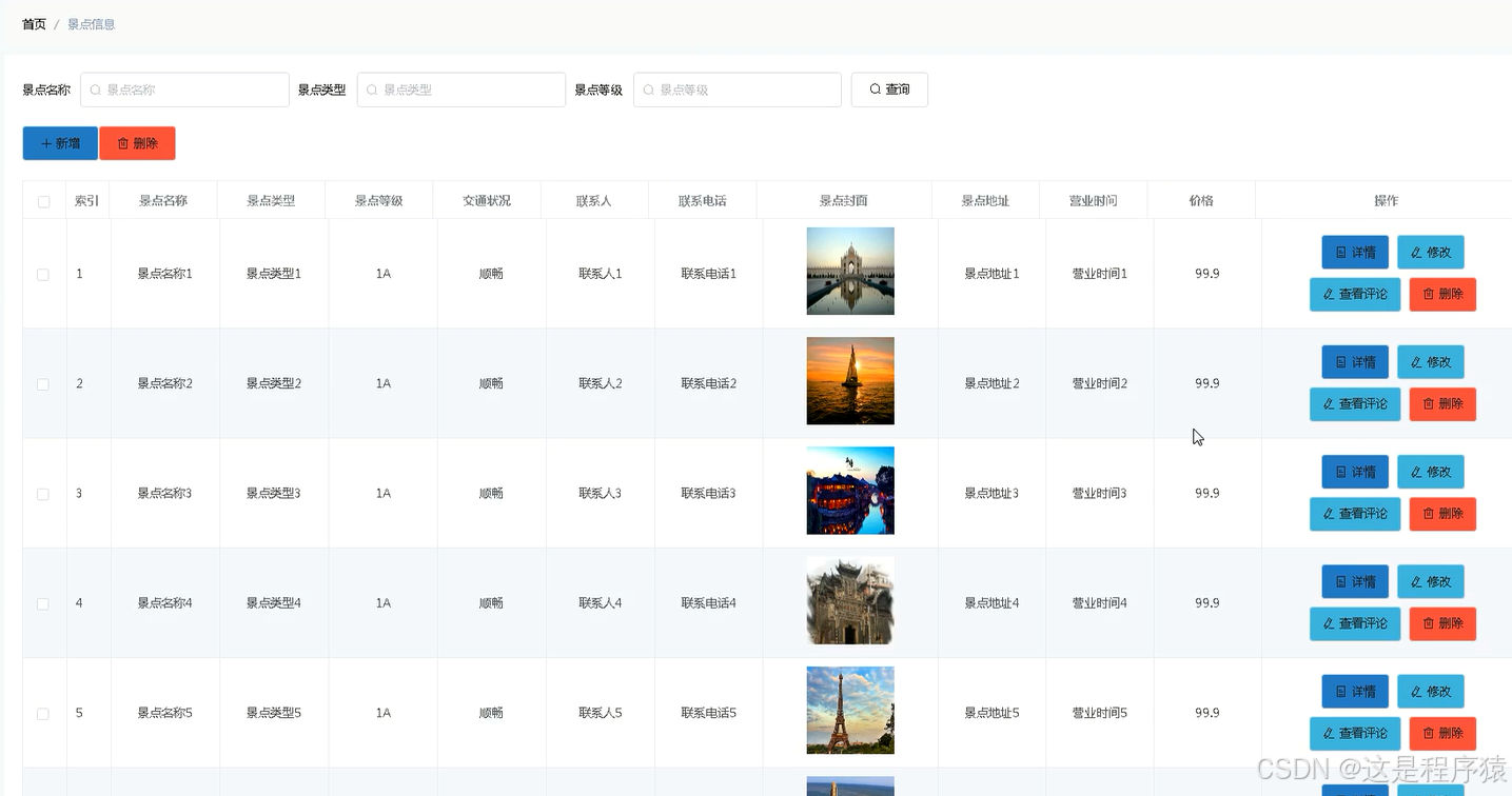 前台可增删改查景点信息,景点信息管理界面展示如图5-15所示。