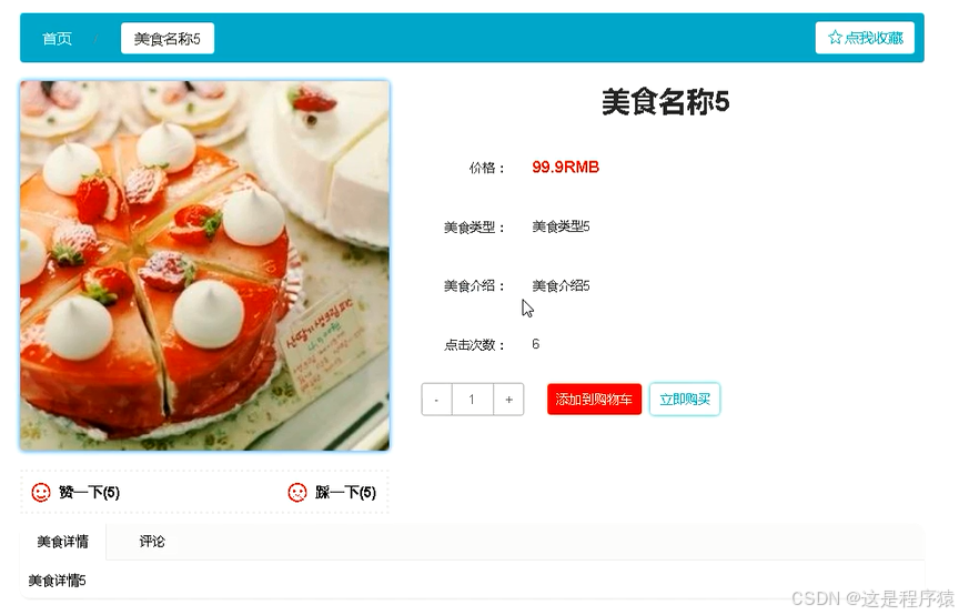 用户在景点美食详情界面可查看景点美食详细信息,登录后可加入购物车或者立即购买操作,景点美食详情界面展示如图5-4所示。