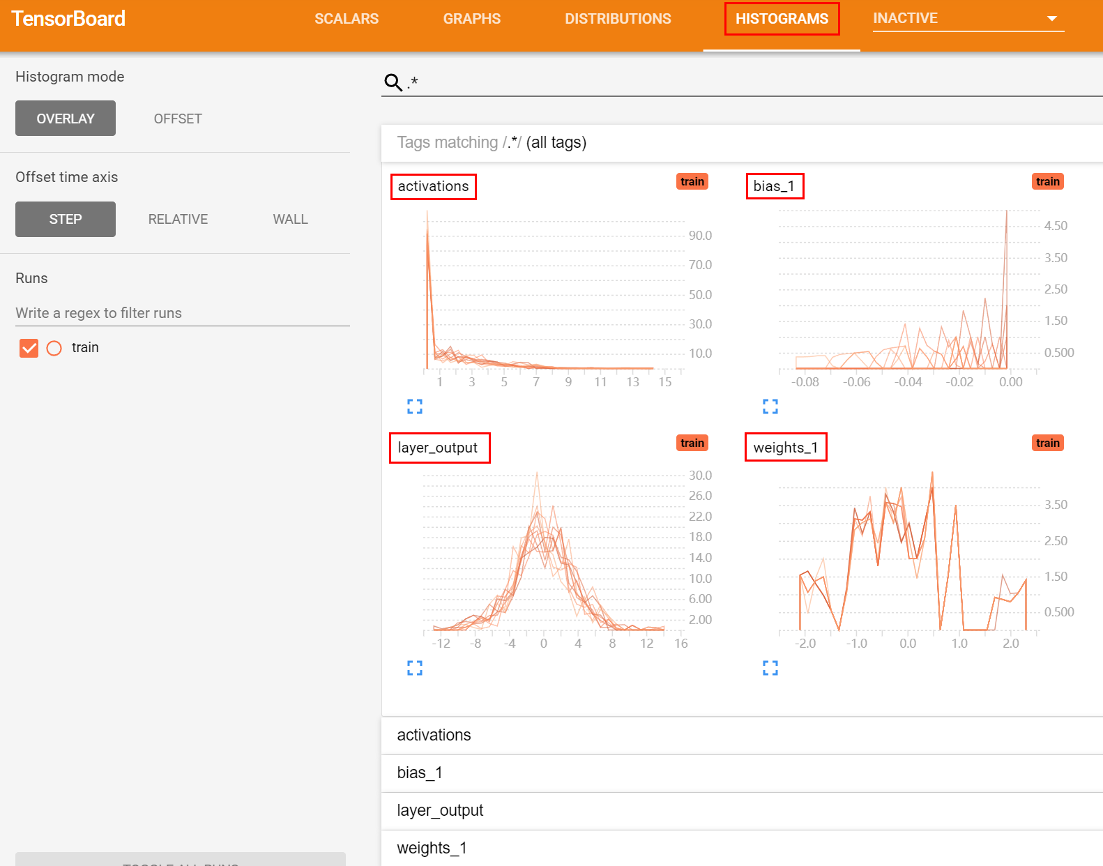 - HISTOGRAMS:权重、偏置、激活值的分布