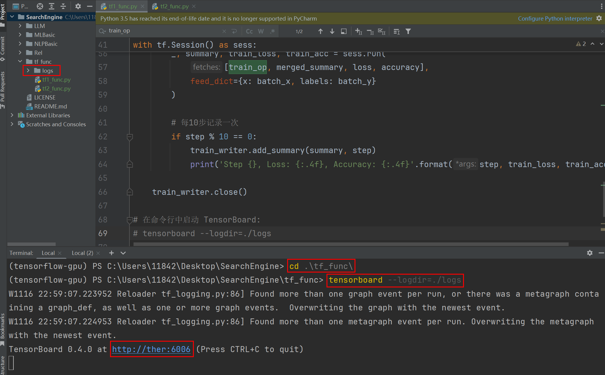 在命令行中启动 TensorBoard(注意,一定要在 logs 文件的上一层目录下输入该命令,否则打开TensorBoard 会显示 No scalar data was found. ):
