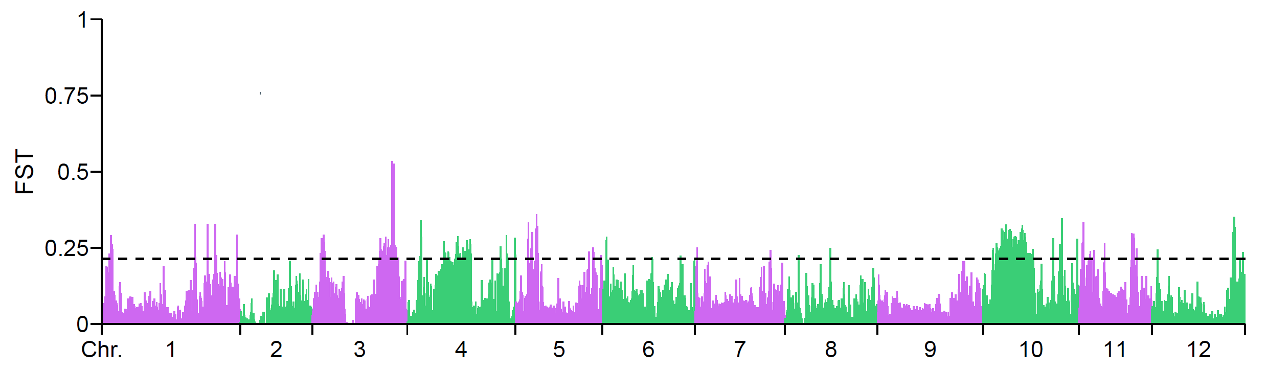 - 图展示了 基因组各染色体上成千上万个 SNP 位点的 FST 值分布
