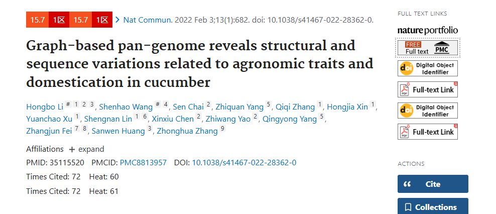 **文章:**Graph-based pan-genome reveals structural and sequence variations related to agronomic traits and domestication in cucumber