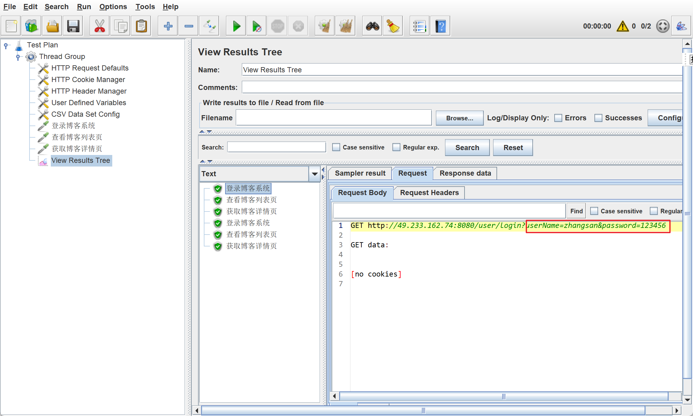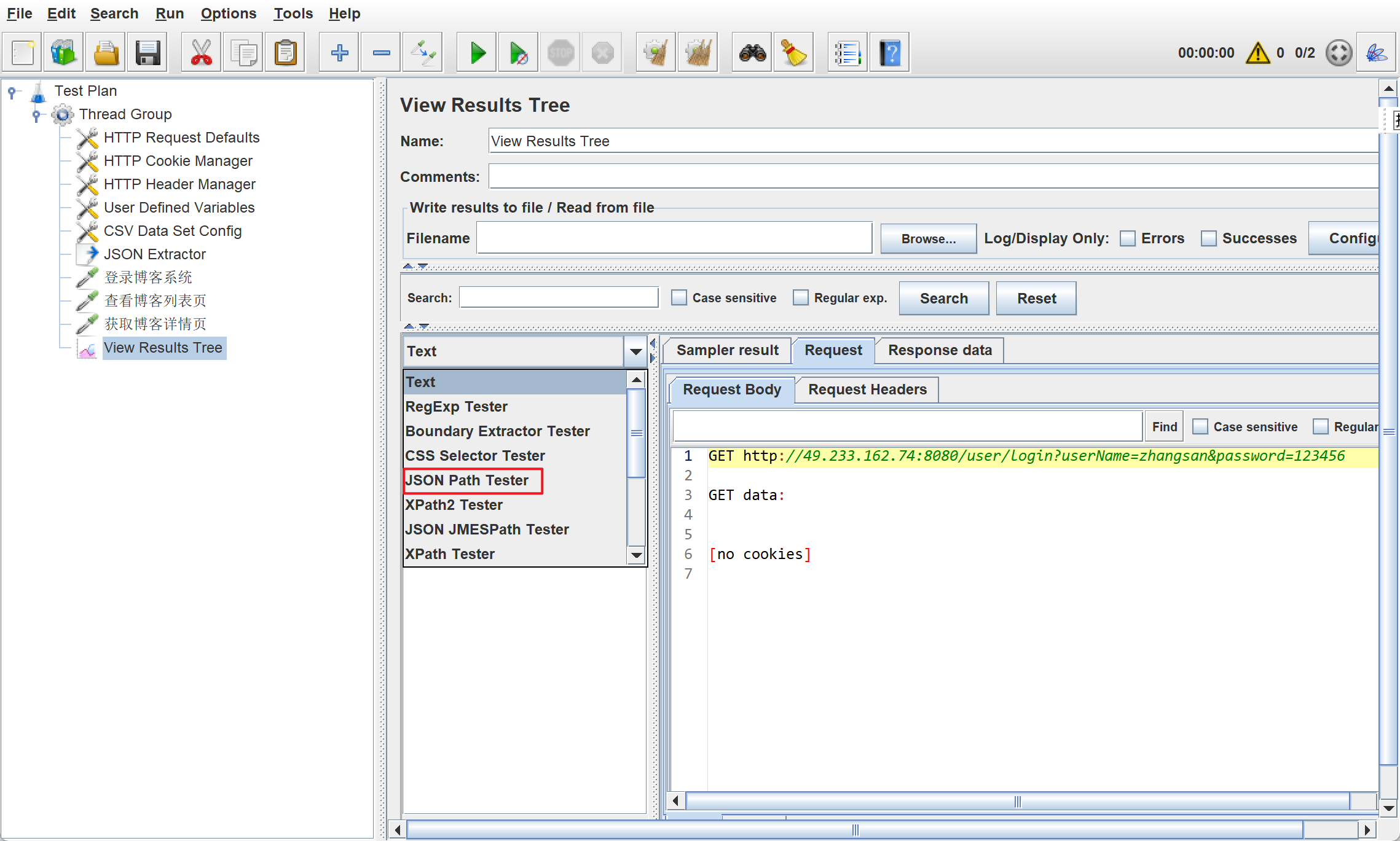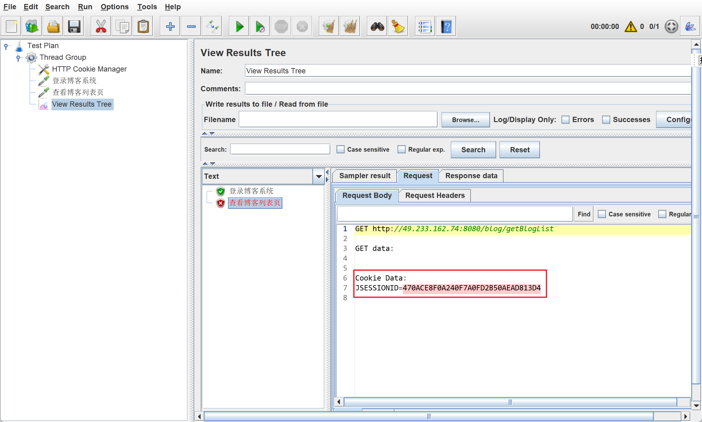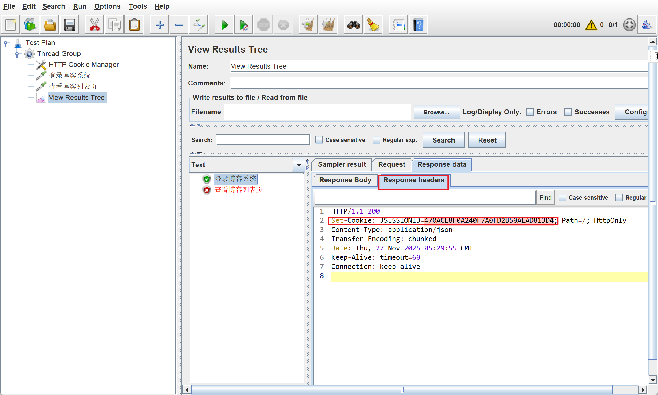 设置Cookie管理器后,Cookie也不会直接显示在管理器中,而是可以通过查看结果树中的登录响应和下一次请求进行查看;