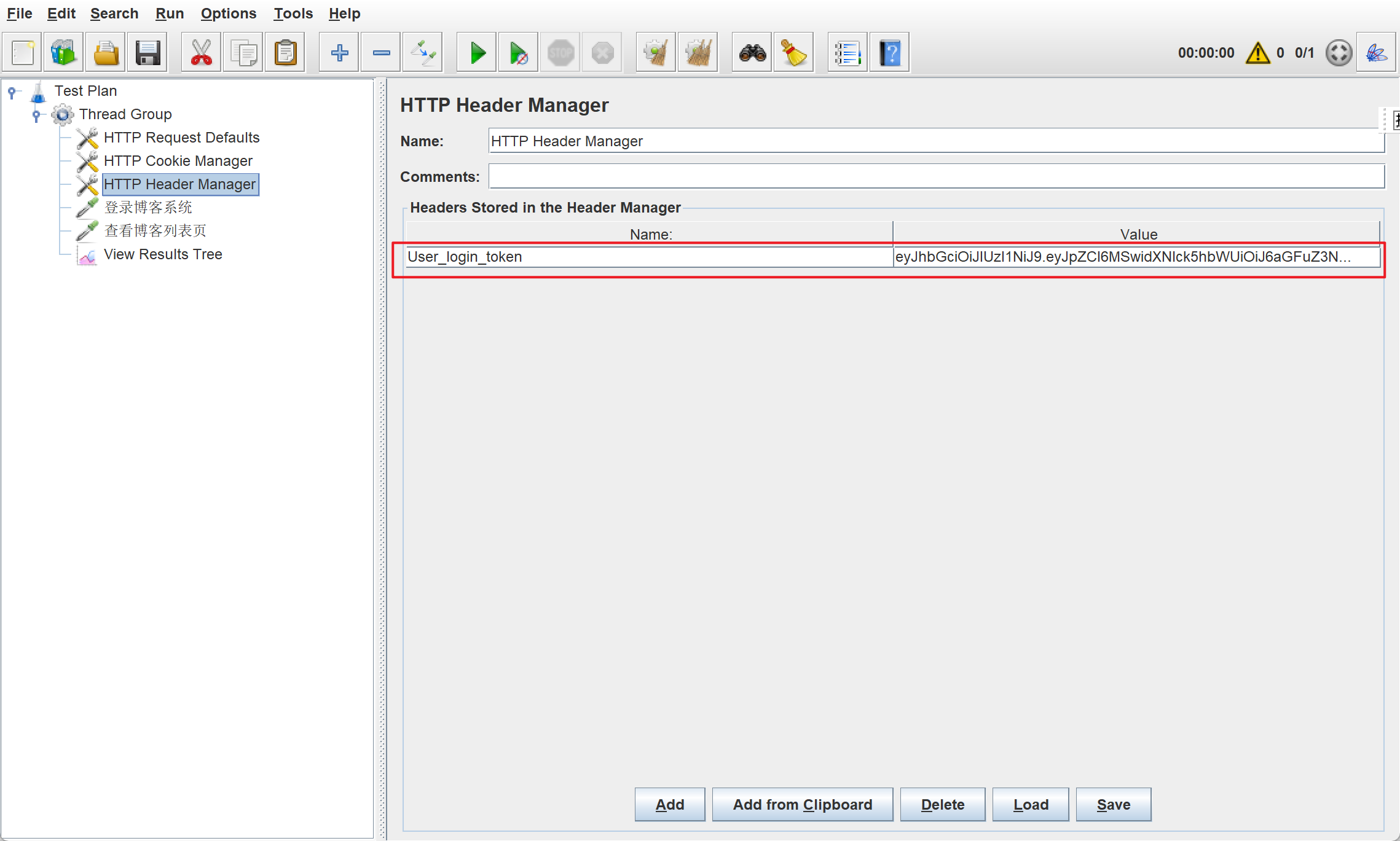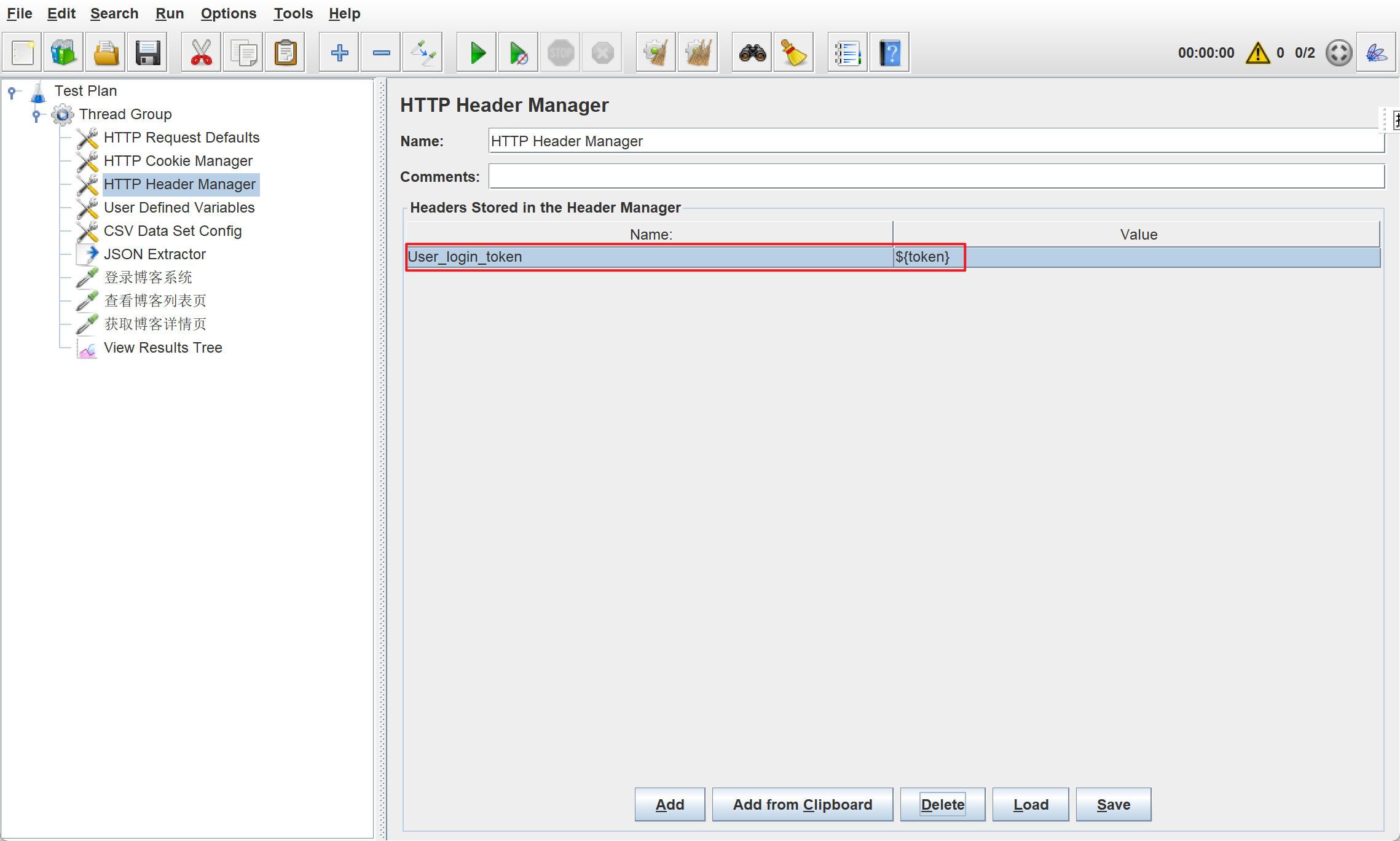 修改请求头管理器中固定的登录凭证为每次登录时获取的登录凭证: