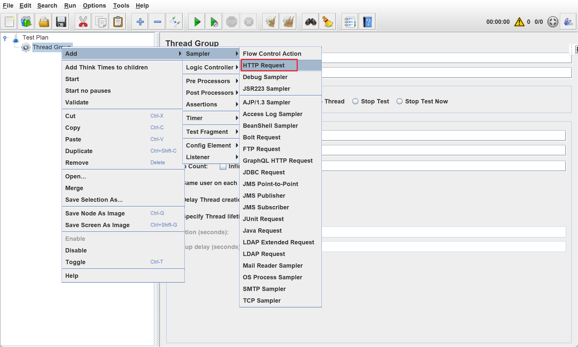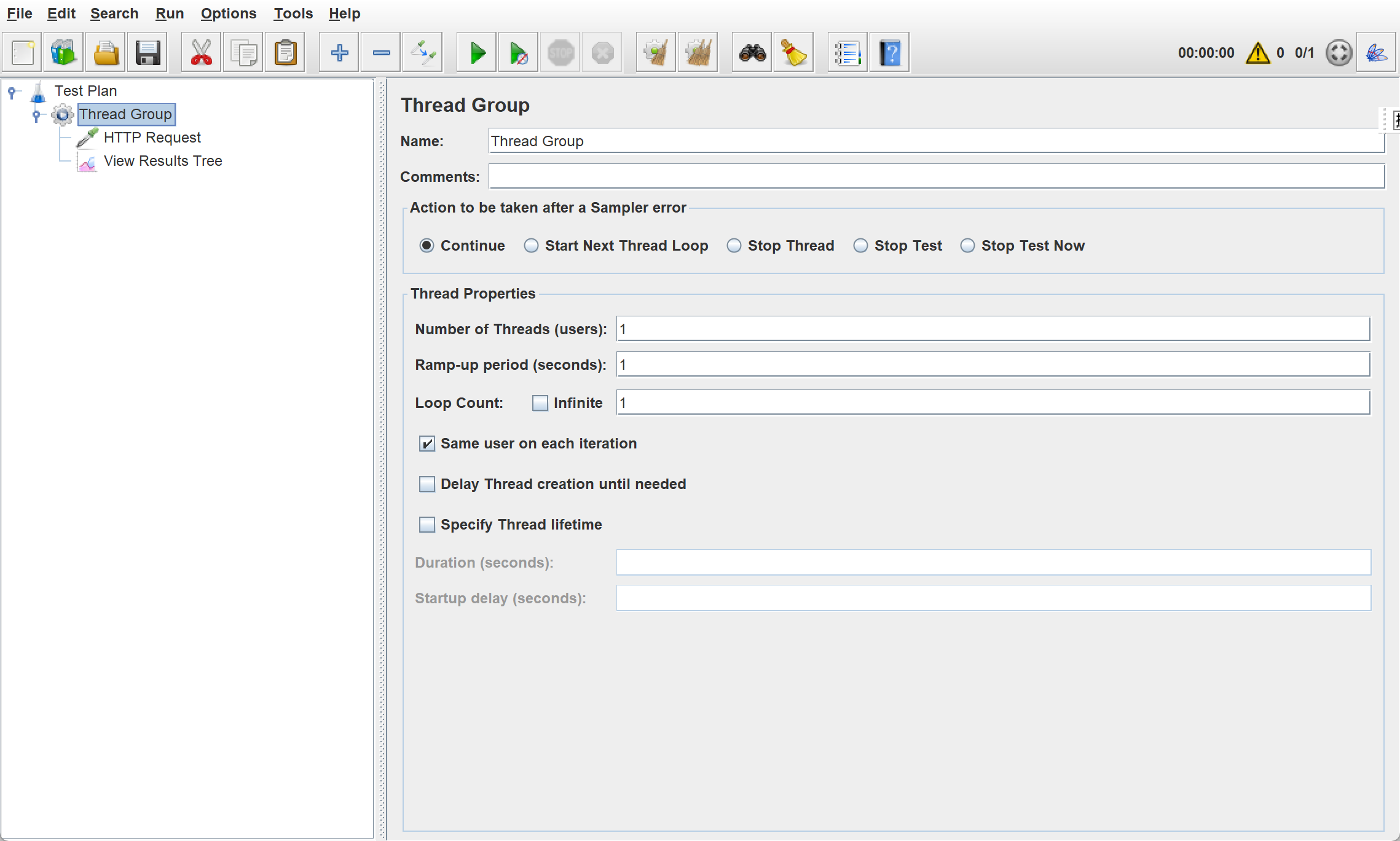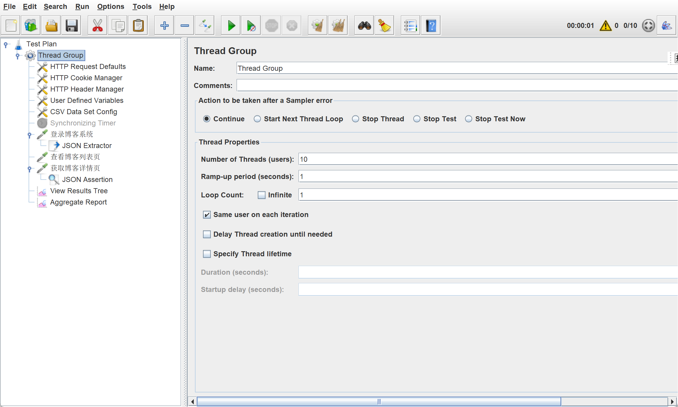 - Ramp-up period(seconds):线程启动的指定时间,例如填写1就表示,所有线程在1s内启动;