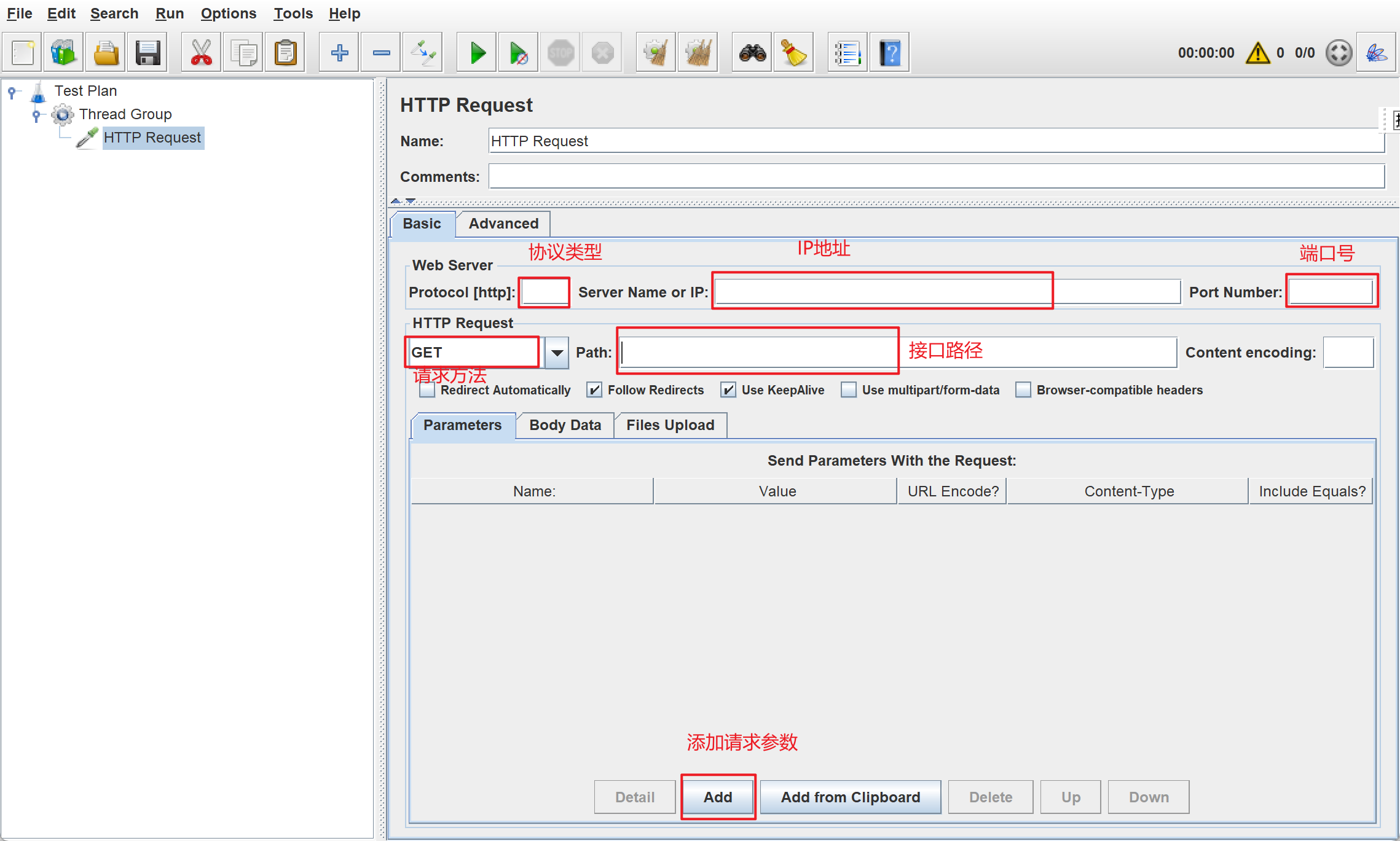 根据要访问接口,按照图示填写协议类型,IP地址,端口号,请求方法,接口路径,以及请求参数;