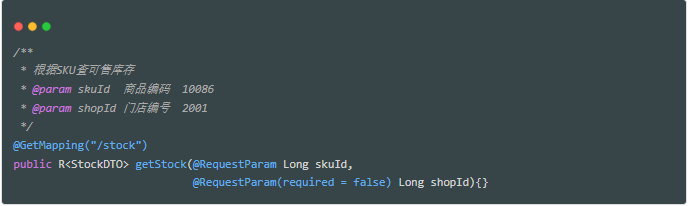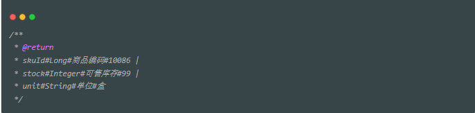 返回值:@return用"字段#类型#含义#示例",多行以"|"分隔
